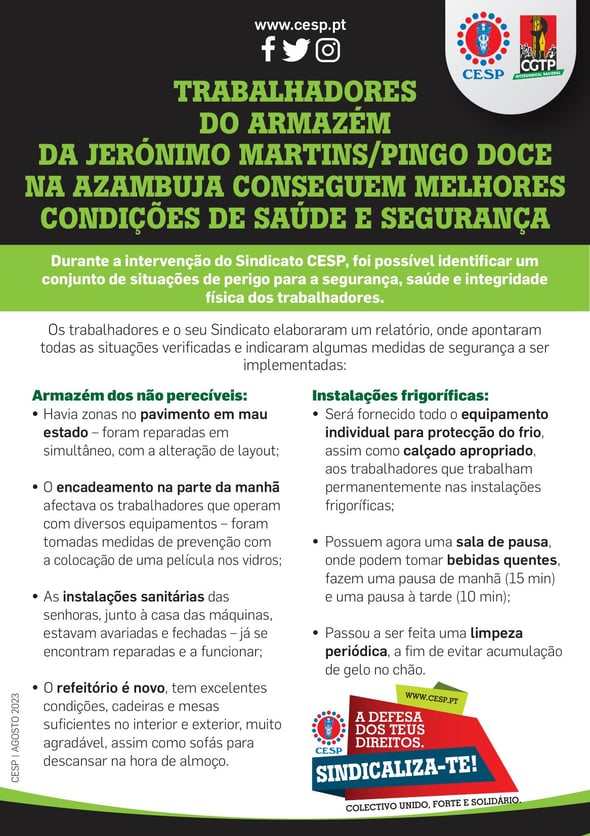 Trabalhadores do Armazém da Jerónimo Martins/Pingo Doce na Azambuja conseguem melhores condições de saúde e segurança