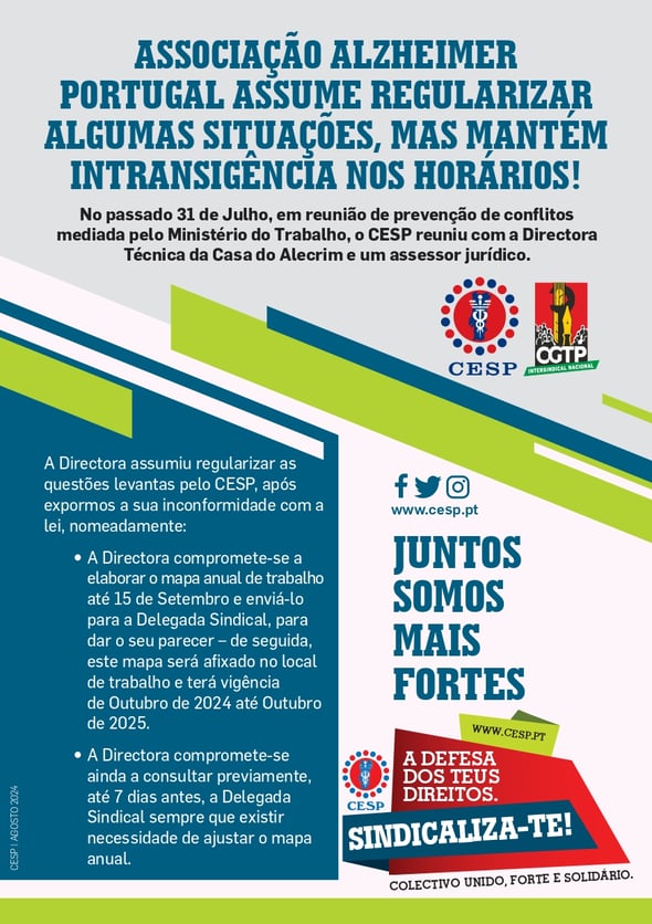 ASSOCIAÇÃO ALZHEIMER PORTUGAL ASSUME REGULARIZAR ALGUMAS SITUAÇÕES, MAS MANTÉM INTRANSIGÊNCIA NOS HORÁRIOS!