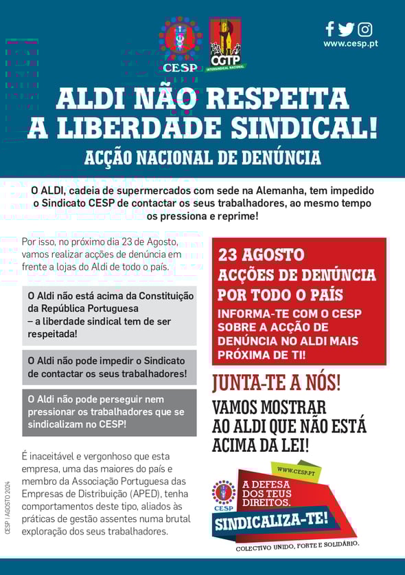 ALDI NÃO RESPEITA A LIBERDADE SINDICAL! ACÇÃO NACIONAL DE DENÚNCIA | 23 AGOSTO