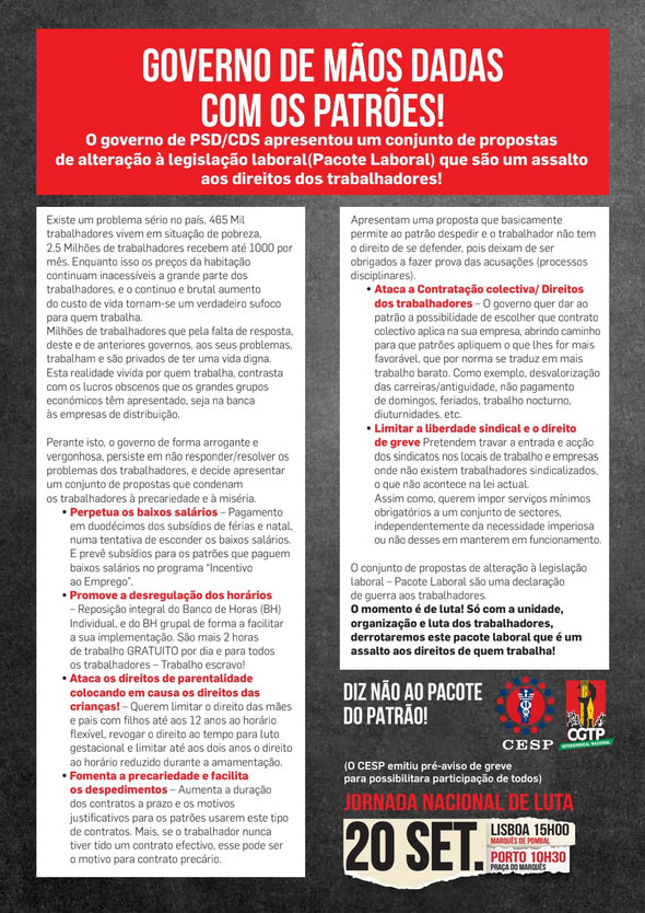 20 SETEMBRO | GREVE E MANIF. CONTRA O PACOTE LABORAL!