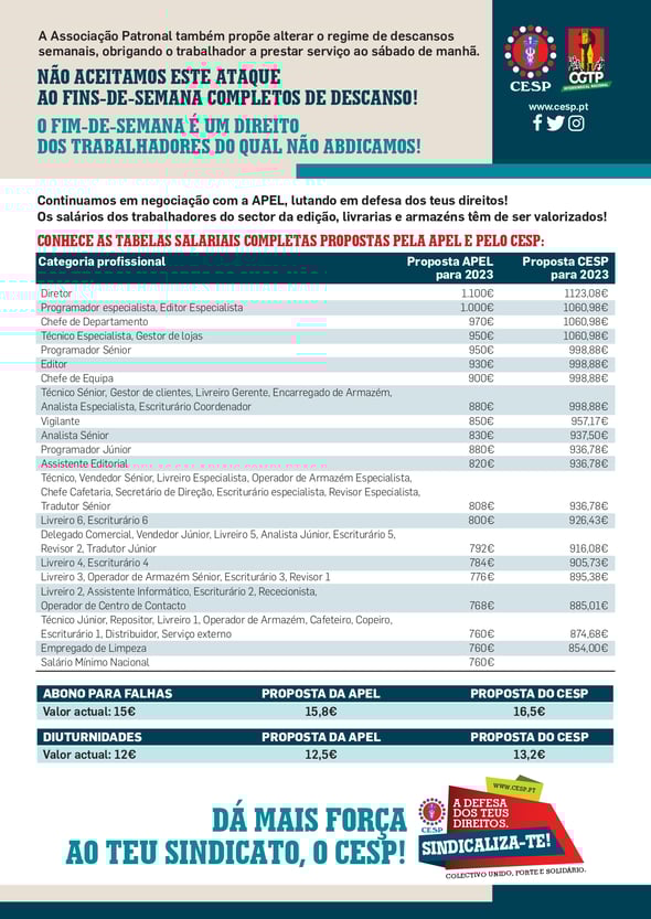 Contrato Coletivo de Trabalho entre a Associação Patronal APEL (Associação Portuguesa de Editores e Livreiros) e a FEPCES (Federação Portuguesa dos Sindicatos do Comércio, Escritórios e Serviços — que o CESP integra) e outros Sindicatos.