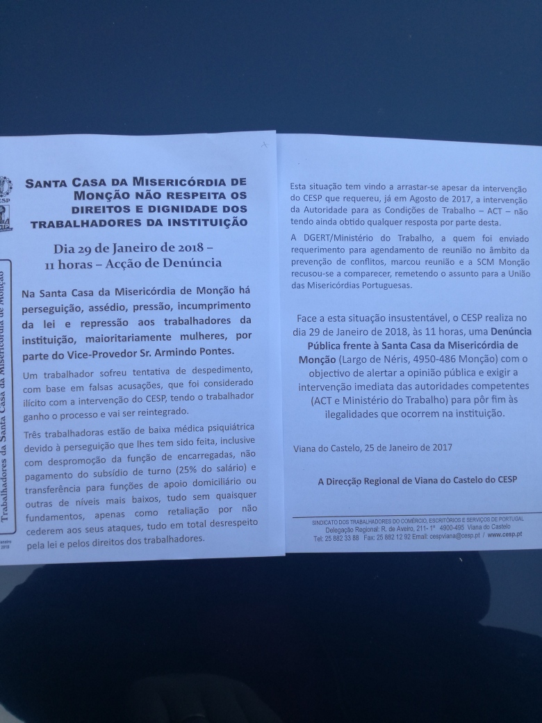 Face a esta situação insustentável, o CESP realiza no dia 29 de Janeiro de 2018, às 11 horas, uma Denúncia Pública frente à Santa Casa da Misericórdia de Monção (Largo de Néris, 4950-486 Monção) com o objectivo de alertar a opinião pública e exigir a intervenção imediata das autoridades competentes (ACT e Ministério do Trabalho) para pôr fim às ilegalidades que ocorrem na instituição.