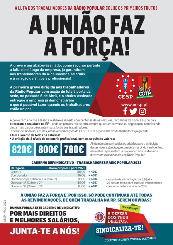 Graças à intervenção dos trabalhadores organizados no seu sindicato de classe, O CESP (Sindicato dos Trabalhadores Comércio, Escritório e Serviços de Portugal), o Grupo Reditus foi obrigado a pagar os três meses de salários e subsídios de refeição em atraso.